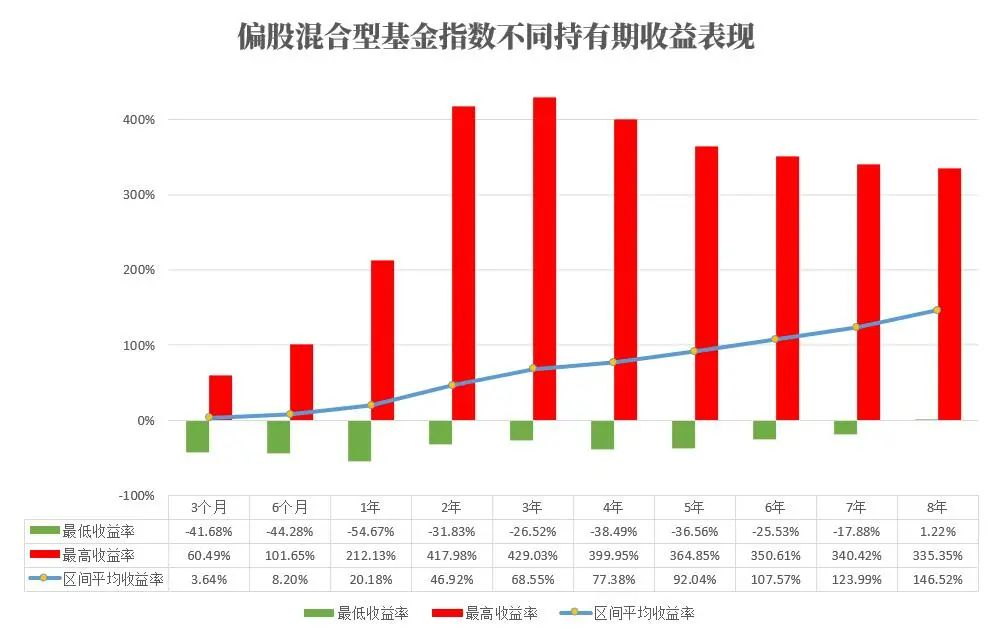 除了提升正收益的概率,我們投資基金自然也希望獲得更好的收益體驗(yàn)。我們?nèi)砸云苫旌闲突鹬笖?shù)(Wind代碼:885001.WI)為例,統(tǒng)計(jì)從指數(shù)設(shè)立開始至2022年底近20年的數(shù)據(jù),任意一天內(nèi)買入該指數(shù),分別持有3個月、6個月、1年、2年、3年、5年、6年、7年、8年的平均收益率。
