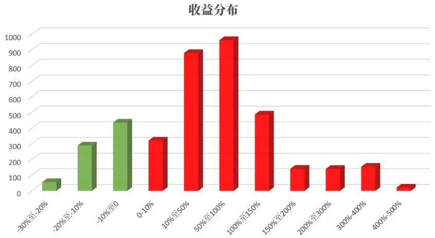 從中我們可以看到,獲得極高與極低收益次數(shù)的機(jī)會都比較少,最多的收益區(qū)間還是落在50%-100%當(dāng)中,而平均收益率68.55%也在這一區(qū)間之中。其實(shí),只要采用持有這一簡單的行為,大概率上我們會獲得一個還不錯的收益。